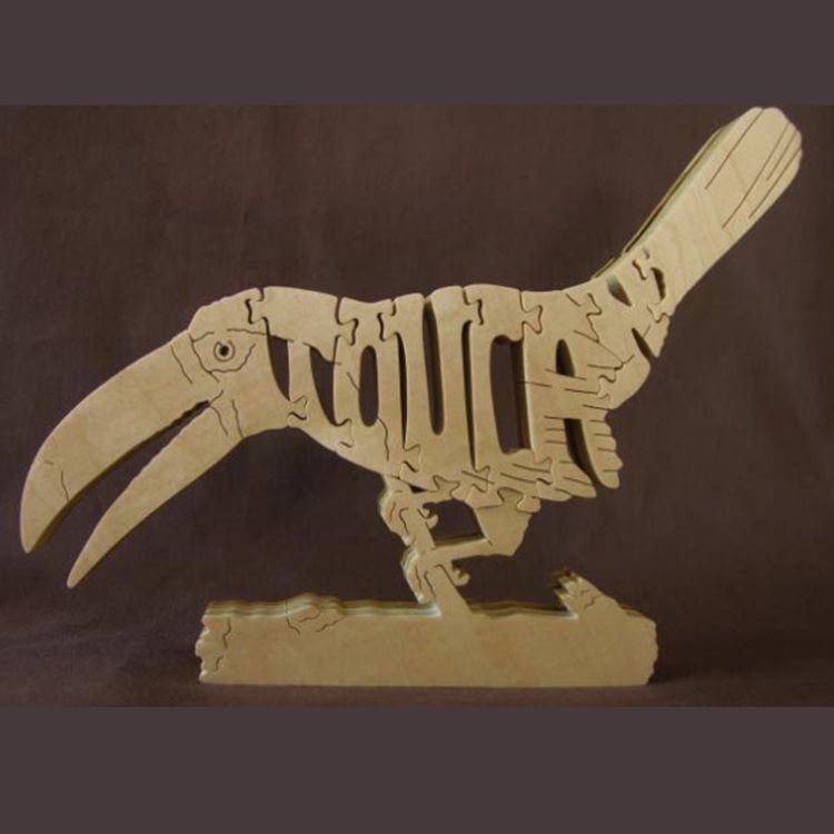 A wooden puzzle of a Toucan, perched.
