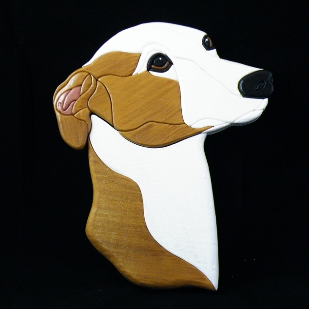 Painted wood piece of a Whippet head shot